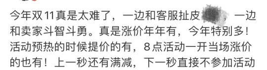 还有网友称依然碰到了“先涨价再降价”“付尾款时涨价”等套路,“平时经常吃的面粉是185一袋,双11参加满减活动涨到了240元一袋。”