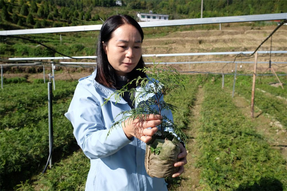 黄吉兰在查看崖柏幼苗情况。新华社记者李晓婷 摄