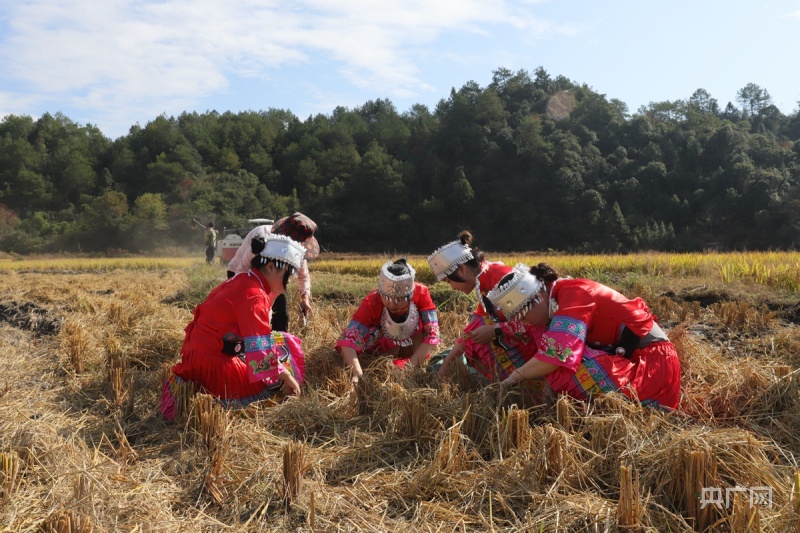 南平市光泽县寨里镇浆源畲族村最后一批晚稻田迎来丰收(央广网发 傅贤斌 摄)