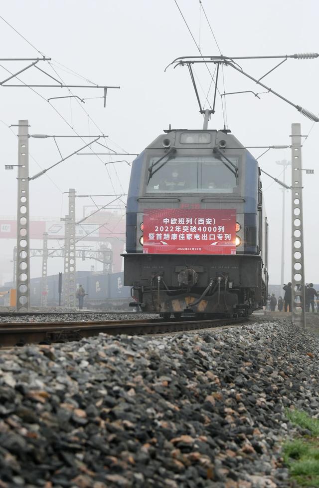 ↑11月23日,满载家电产品的中欧班列从西安国际港站驶出。