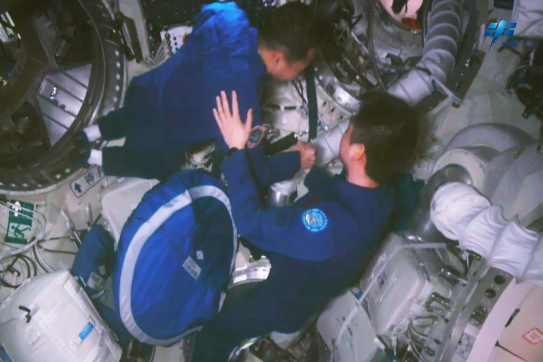 △神舟十四号乘组指令长陈冬在舱门口迎接神舟十五号乘组指令长费俊龙