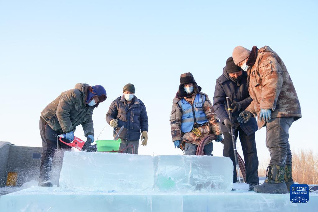12月8日,施工人员在哈尔滨冰雪大世界园区制作冰体景观。