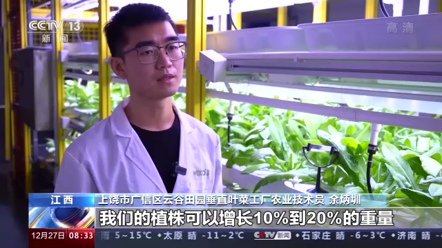 江西省上饶市广信区云谷田园垂直叶菜工厂农业技术员 余炳圳:我们的植株可以增长10%到20%的重量,因为是立体式的,是同等面积下普通种植的十三四倍。