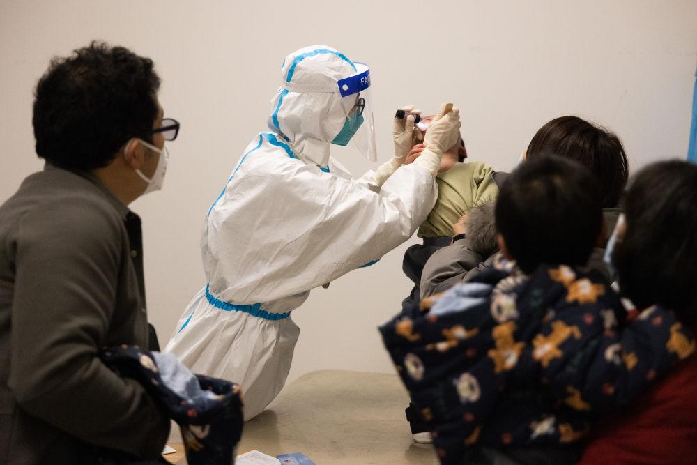 12月27日,在上海交通大学医学院附属新华医院儿科发热门诊,医生陈旭婷在检查患儿状况。新华社记者 金立旺 摄