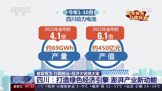今年1—10月,四川绿色低碳优势产业增加值增长18.9%,比规上工业高15.9个百分点,动力电池、晶硅光伏、钒钛产业分别增长146%、70.3%、31.8%。