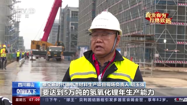 雅宝新时代锂电池材料生产项目现场负责人 绍玉强:我们这个项目要达到5万吨的氢氧化锂年生产能力,能够满足150万辆新能源汽车的需求,能达到1亿吨二氧化碳减排的效果。