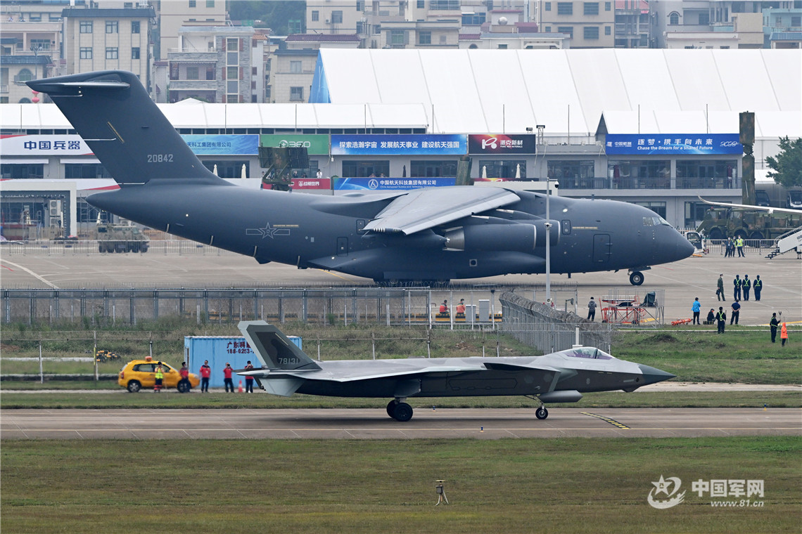 2022年11月5日,珠海,进行第十四届中国航展适应性训练的歼-20飞机降落珠海机场,从运油-20飞机旁滑过。余红春 摄