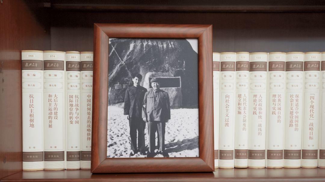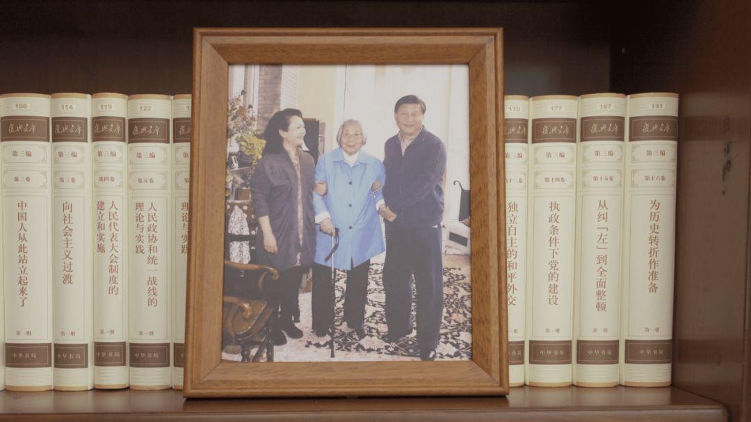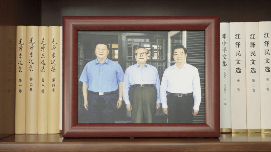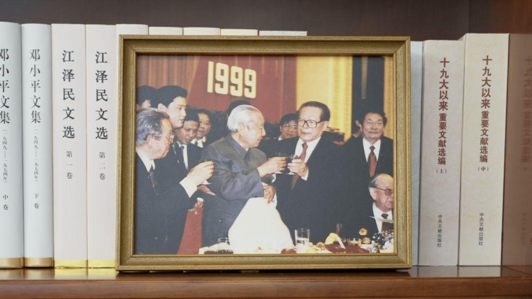 书架上摆放着一张合影。这是1999年9月30日,江泽民同志、朱镕基同志、习仲勋同志在庆祝建国五十周年招待会上。这张照片第一次出现在习近平总书记的书架上。
