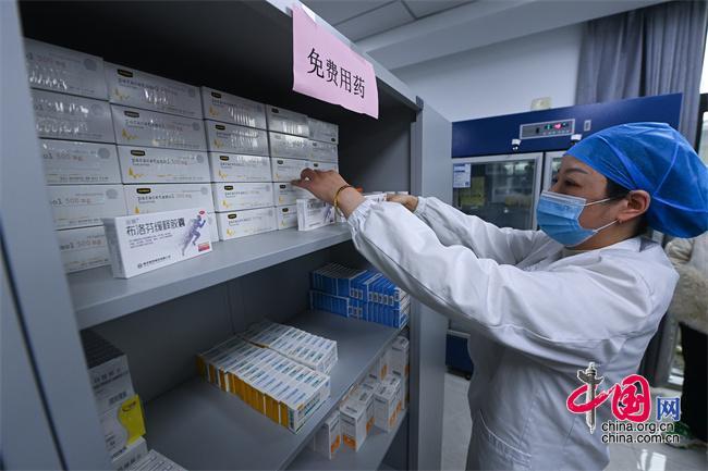 2022年12月28日,在浙江省湖州市织里镇轧村村卫生室的药房内,医生在整理一批免费赠给村民的解热镇痛药物。新华社记者 徐昱 摄