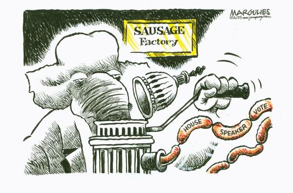 参考消息网1月7日报道大象(代指美国共和党)用国会大厦改装的香肠机把自己的鼻子绞制成一节节香肠。香肠上的文字为“众议院议长选举”,画面背景文字为“香肠工厂”。连日来,因共和党内部关系严重紧张,美国新一届国会众议院议长选举遭遇“难产”,众议院陷入百年不遇的僵局。(原载美国政治漫画网)