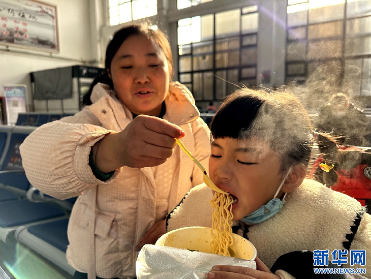 1月7日,一对母女在宁波市余姚火车站候车大厅吃泡面。新华网发 吴大庆 摄