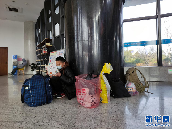 春运首日,在湖州市安吉县客运中心,一位小朋友在候车室内阅读儿童书籍。新华网发
