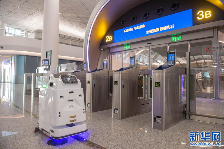 消毒机器人对杭州西站进站口进行消毒作业,迎接春运。新华社记者 江汉 摄