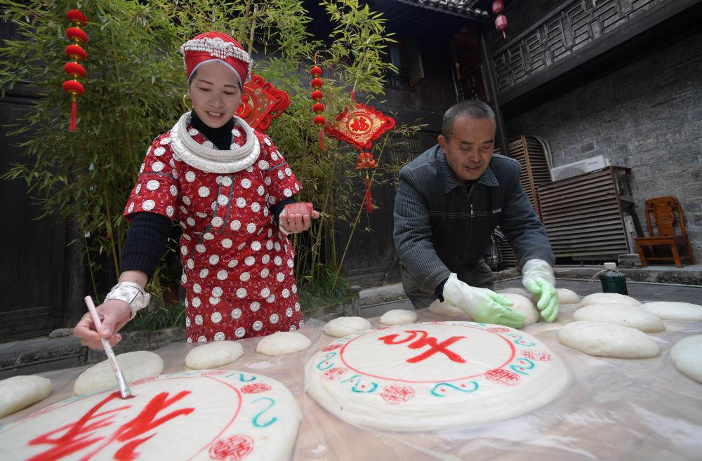 1月15日,在黄平县旧州古镇,村民给香糯糍粑印花上色。