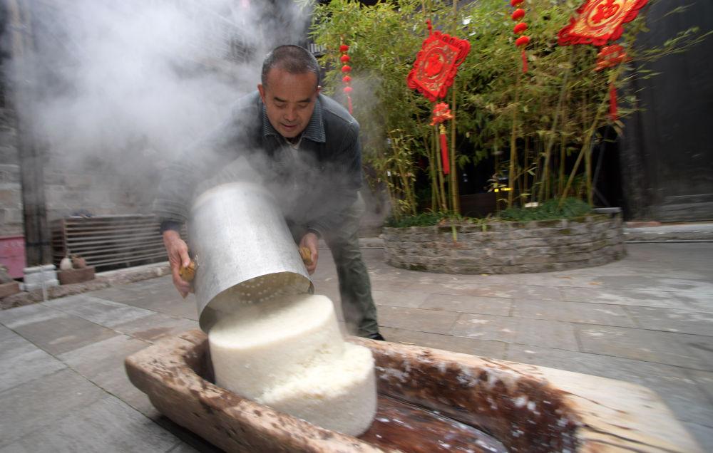 1月15日,在黄平县旧州古镇,村民把刚蒸好的香糯米倒入木槽中,准备打香糯糍粑。