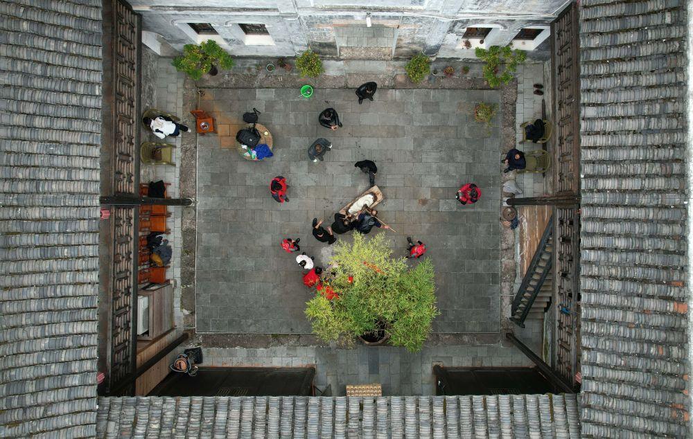 1月15日,在黄平县旧州古镇,村民在打糍粑(无人机照片)。