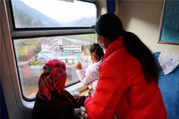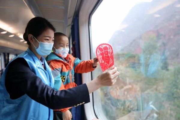 中国铁路昆明局集团有限公司青年志愿者在“慢火车”上贴窗花、送福字,更为车厢带来了浓郁的年味。