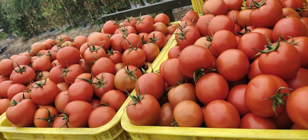 距离黄妙想的番茄地不远,一个由村里合作社经营管理的收购点时而有货车往来,合作社负责人黄庭兴忙着处理手机上的各类信息。“百林村秋冬蔬菜种植面积超过3000亩,年产量4000万斤以上。合作社经营的番茄已被认定为绿色产品,我们还租用了冷库,保障蔬菜品质。”黄庭兴介绍,目前,当地蔬菜主要销往南方的云南、贵州、广东以及北方的京津冀等地。