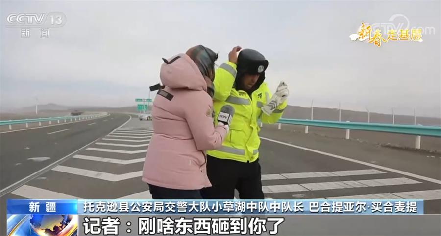 托克逊县公安局交警大队小草湖中队交警 周正闯:大风那种压迫感,给你感觉已经呼吸都呼吸不出来了,眼睛里面、鼻子里面、头发里面全是沙子,眼泪直流。