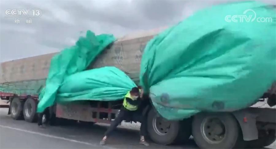 新办法仍然没有奏效,交警和司机商量后,决定将车往前开,寻找一处风小的地方将篷布重新盖到车上。