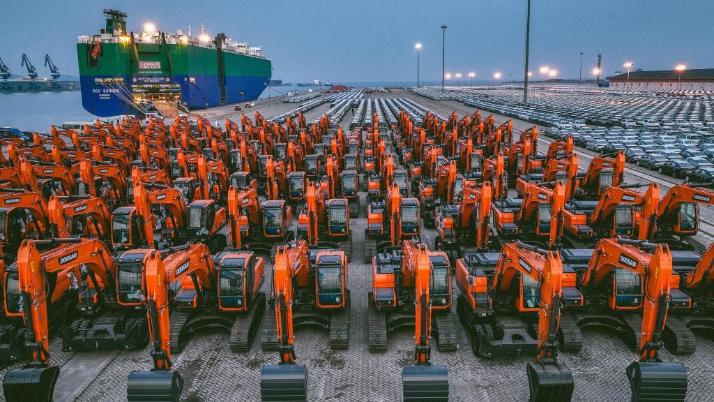 1月18日,在烟台港商品车滚装码头,外贸商品车在等候发运(无人机照片)。(新华社记者朱峥摄)