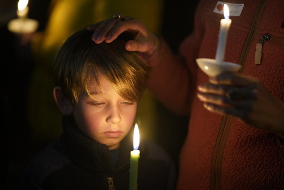1月27日,一个男孩在美国加利福尼亚州半月湾市举行的守夜活动中哀悼枪击事件遇难者。新华社记者 吴晓凌 摄