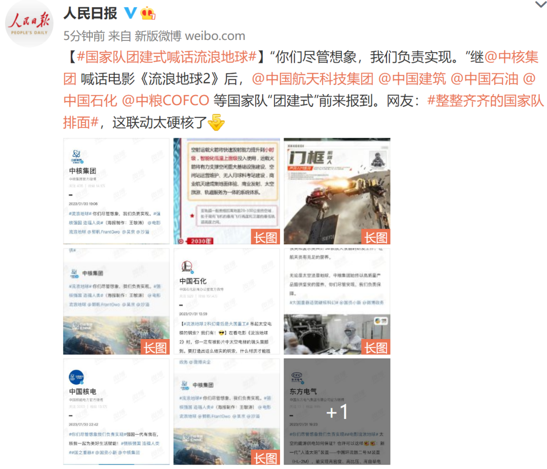 “你们尽管想象,我们负责实现。”继中核集团喊话电影《流浪地球2》后,中国航天科技集团、中国建筑、中国石油、中国石化、中粮集团等国家队“团建式”前来报到。网友:整整齐齐的国家队排面,这联动太硬核了!
