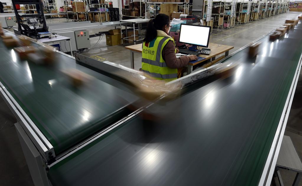 工作人员在河南保税物流中心对快递包裹进行分拣。新华社记者李嘉南 摄