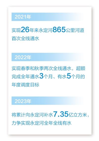2017年以来,水利部不断强化永定河流域水资源统一调度,实现当地水、引黄水、引江水和再生水“四水统筹”,集中开展向永定河生态补水。数据显示,通过生态水量调度,永定河2022年实现全线通水123天,超额完成全年通水3个月的年度调度目标,全年补水量、全线通水时长,均达到近年之最。