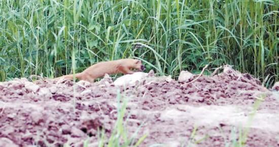 黄鼬在修复完成的野鸭湖湿地示范区活动(资料照片)。野鸭湖湿地自然保护区供图