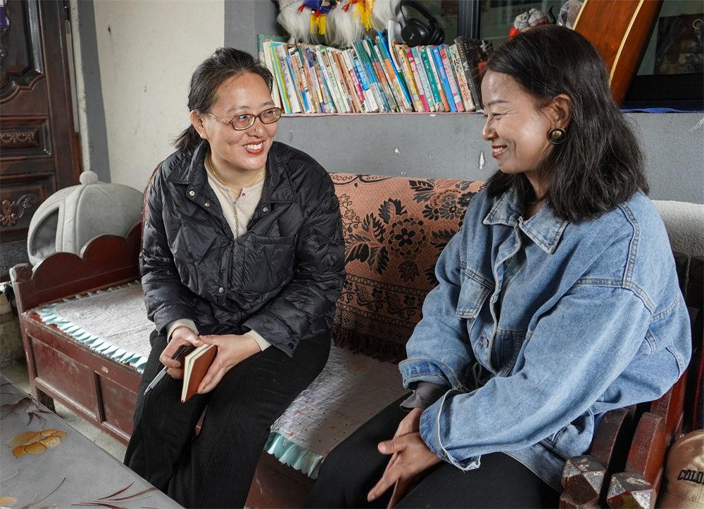 在西藏墨脱县德兴乡德兴村,白玛曲珍(左)在村民格桑曲珍家了解手工艺品制作和销路情况(2月19日摄)。新华社记者 王泽昊 摄