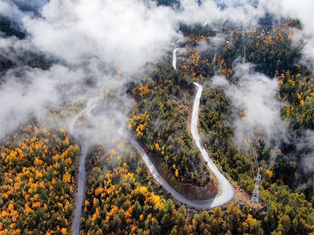 2020年11月5日拍摄的派墨公路米林段一景(无人机照片)。新华社发(董志雄 摄)
