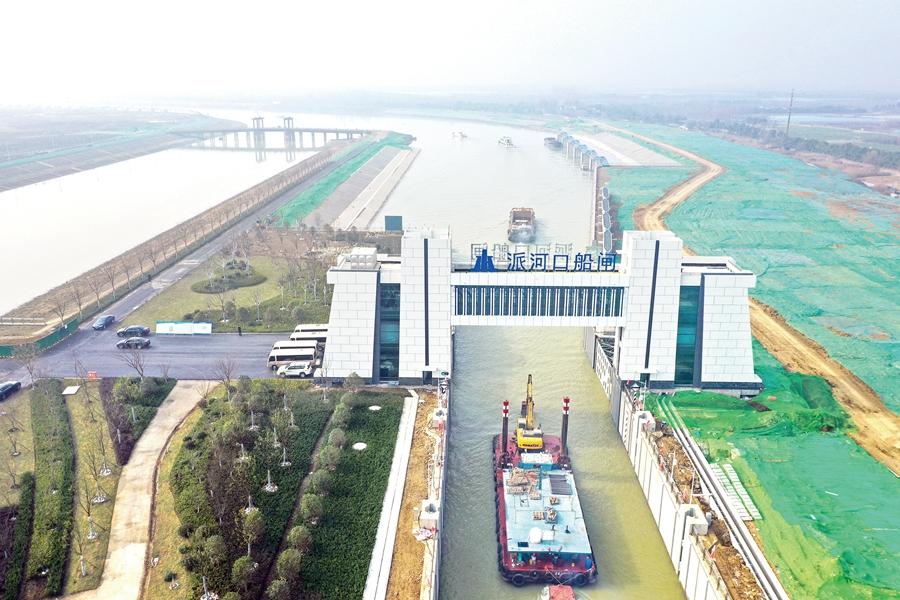 船只通过引江济淮派河口船闸(无人机照片)。 新华社发(刘玉才 摄)
