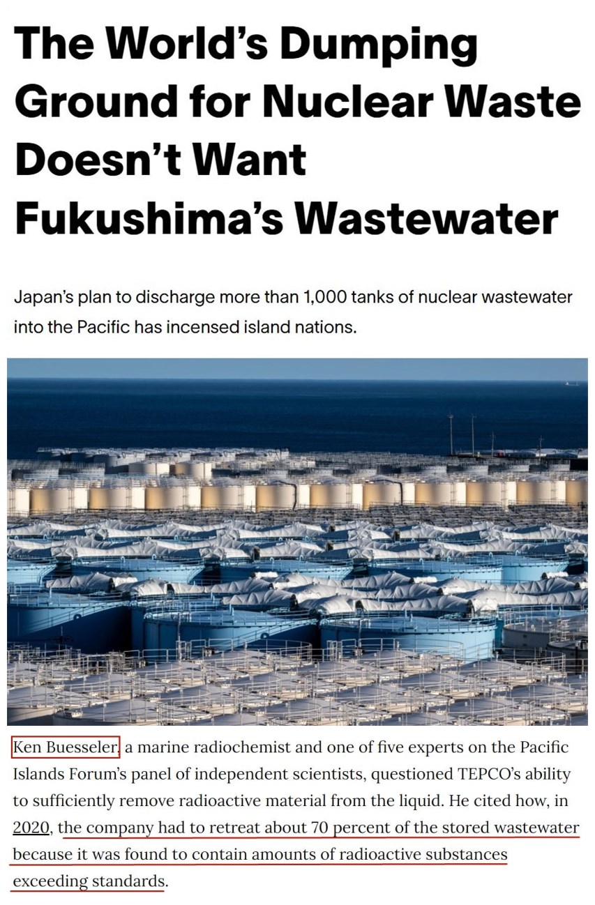 太平洋岛国论坛独立科学家小组的五位专家之一、海洋放射化学家肯·布塞勒在列举了东电公司以往的排放劣迹后指出,如果等到核污染水排入海洋后进行监测将为时过晚,因为一旦排海,东电便再也无法将其收回。