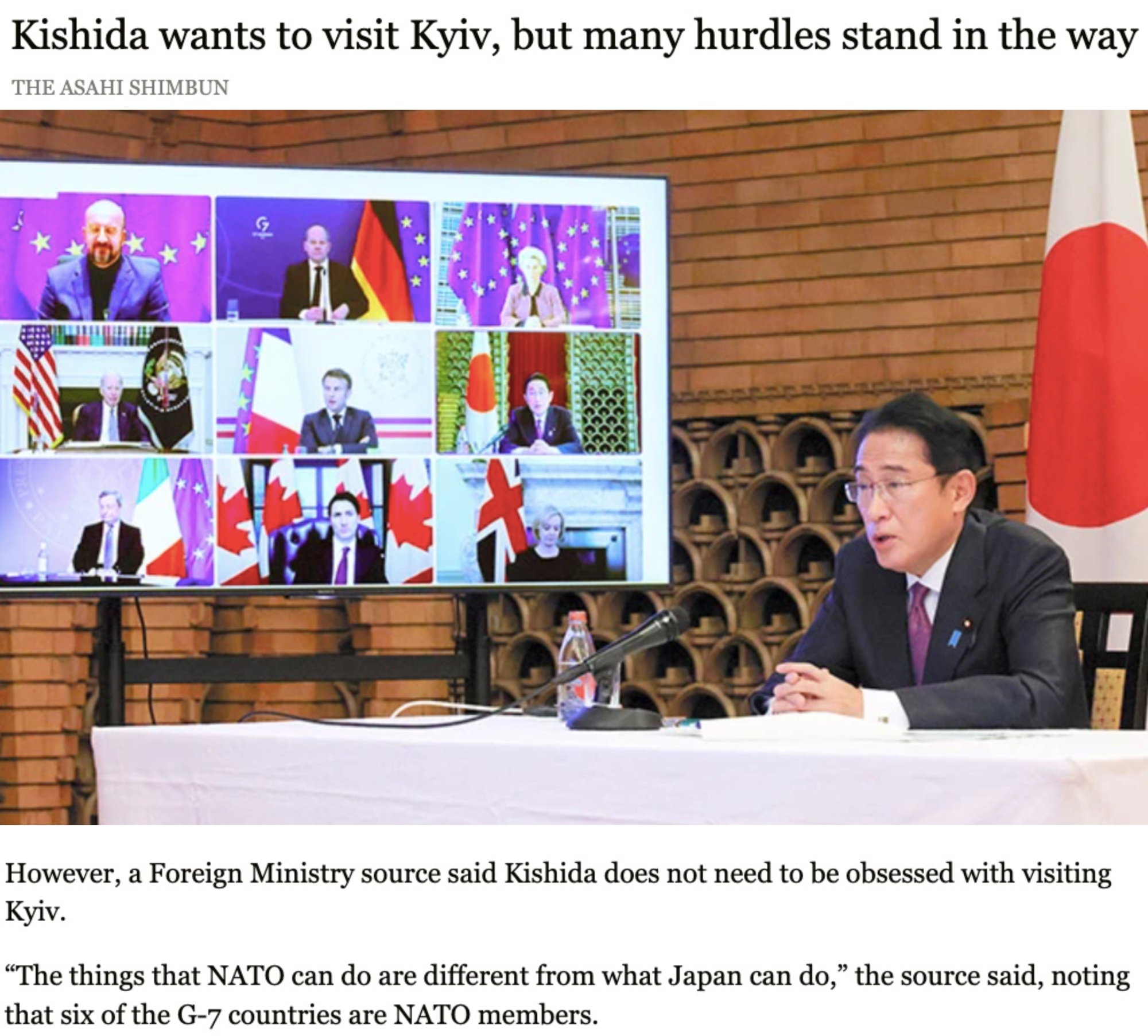 △《朝日新闻》:有日本外交人士表示,领导人访问基辅的G7其他6国均为北约成员国,而北约和地处亚洲的日本是两码事