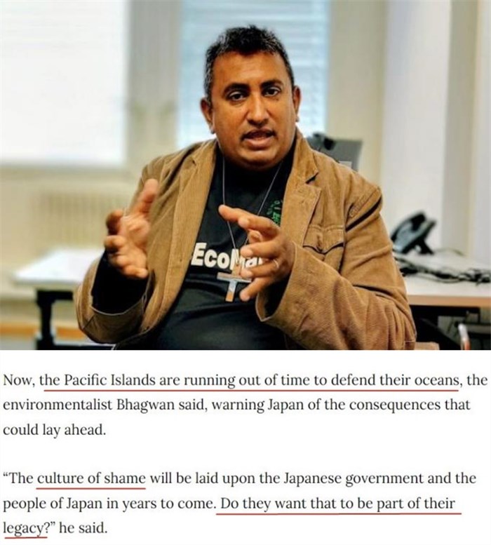 斐济反核及环保活动家詹姆斯·巴格万警告,如果日本执意排海,“日本政府和人民将在未来多年里被置于耻辱中。他们希望这成为他们遗产的一部分吗?!”