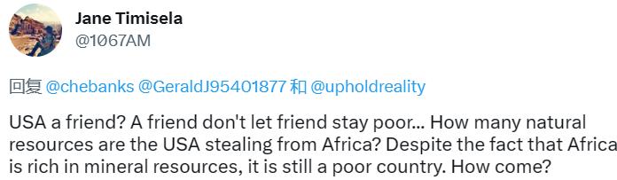 网友@Jane Timisela表示,美国是(非洲的)朋友?朋友是不会让他的朋友一直贫穷下去的……美国从非洲窃取了多少自然资源?尽管非洲拥有丰富的矿产资源,但它仍然很贫穷。