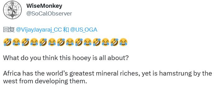 网友@WiseMonkey认为,非洲拥有世界上最丰富的矿产资源,但在开发这些矿产资源方面却受到西方的阻碍。