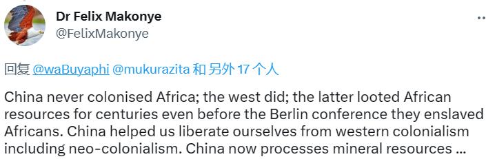 网友@Dr Felix Makonye说道,中国从未殖民过非洲,但西方国家殖民过非洲。西方国家甚至在柏林会议(注:指1884年在德国首都柏林举行的列强瓜分非洲的会议)之前就已经掠夺非洲资源长达几个世纪,他们还奴役了非洲人。中国帮助我们从包括新殖民主义在内的西方殖民主义中解放出来。
