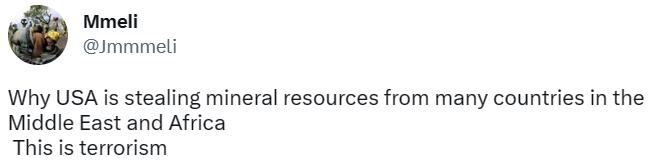 网友@Mmeli说,为什么美国要从中东和非洲的许多国家窃取矿产资源?这是恐怖主义!