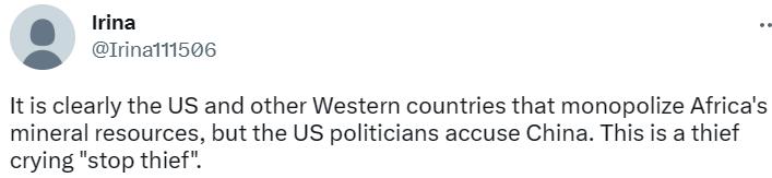 网友@lrina认为,明明是美国等西方国家垄断了非洲的矿产资源,美国的政客们却反倒指责起中国来,这是贼喊捉贼。