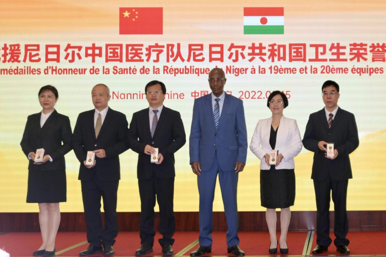 2022年9月15日,第19、20批援尼日尔中国医疗队尼日尔共和国卫生荣誉勋章授勋仪式在南宁举行,陈桂娥(右二)获得尼日尔共和国卫生荣誉勋章。(受访者供图)