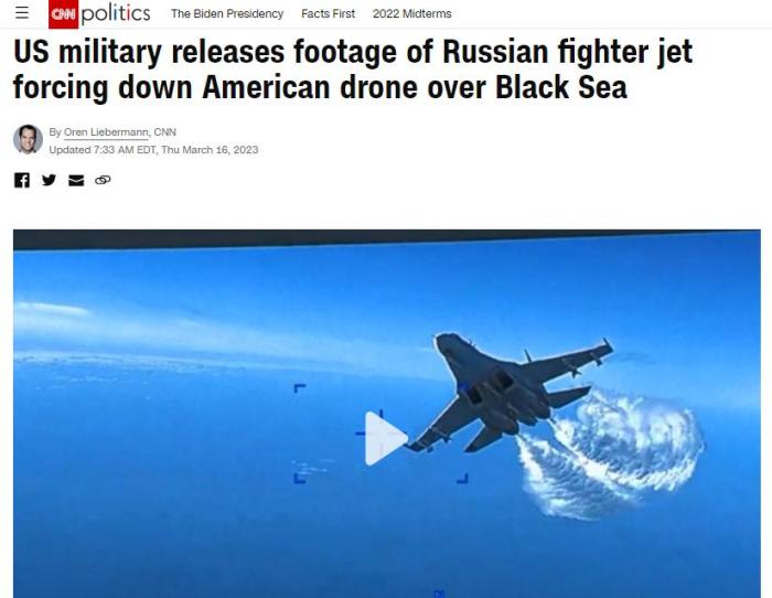 报道还称,当俄罗斯苏-27战斗机再次靠近时,又一次“倾倒燃料”。随后,俄罗斯苏-27战斗机与美国MQ-9“死神”无人机“相撞”,导致螺旋桨受损,无人机的视频也由此中断。不过,CNN同时指出,俄罗斯否认发生了“碰撞”。
