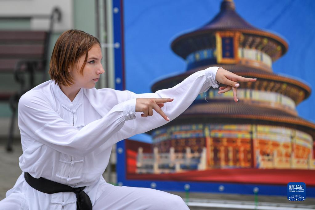 2022年7月14日,在俄罗斯莫斯科,武术爱好者在第二届莫斯科“孔子杯”中国体育与文化艺术项目大赛活动中表演武术。新华社发(亚历山大摄)