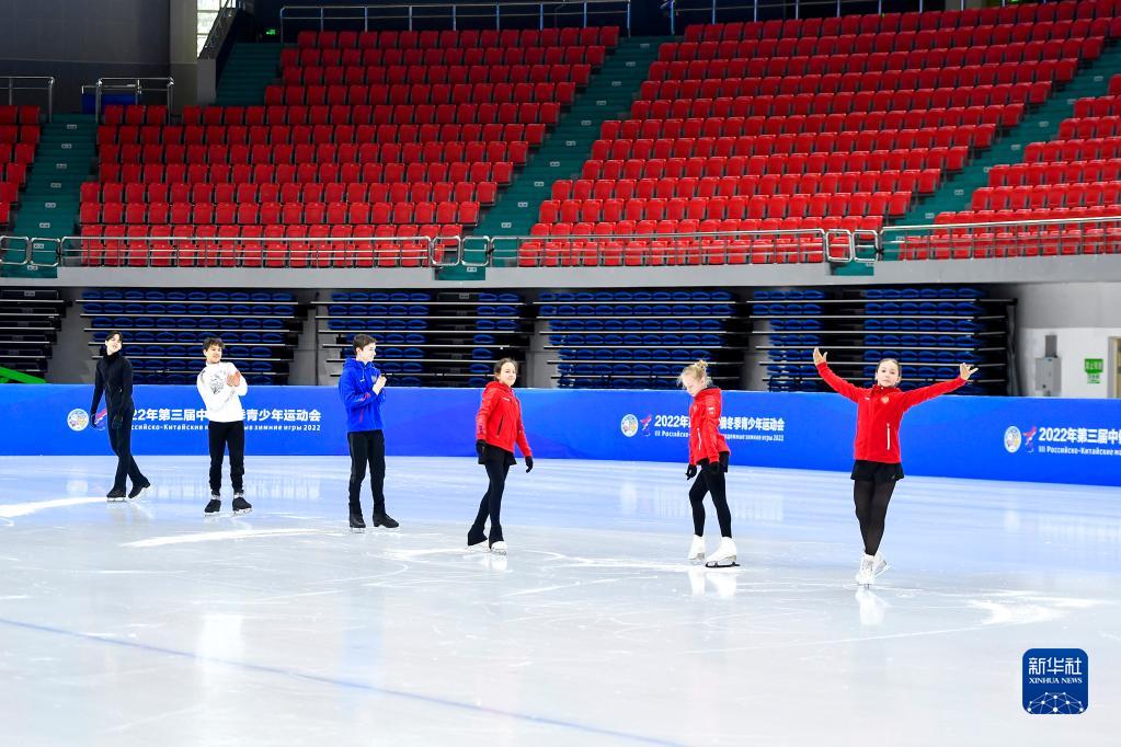 在长春五环体育馆,参加第三届中俄冬季青少年运动会的俄罗斯花样滑冰运动员在赛前场地适应性训练时向场边的中国运动员致意(2022年12月15日摄)。新华社记者 许畅 摄