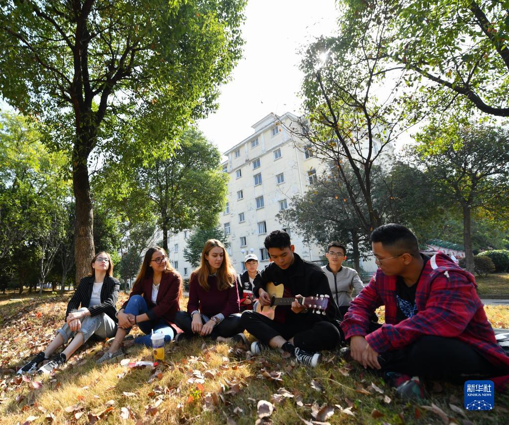 作为中俄交换生在江西省华东交通大学就读的俄罗斯姑娘米卡科娃·娜塔莉亚(左三)在学校欣赏同学弹奏(2019年10月31日摄)。新华社记者 胡晨欢 摄