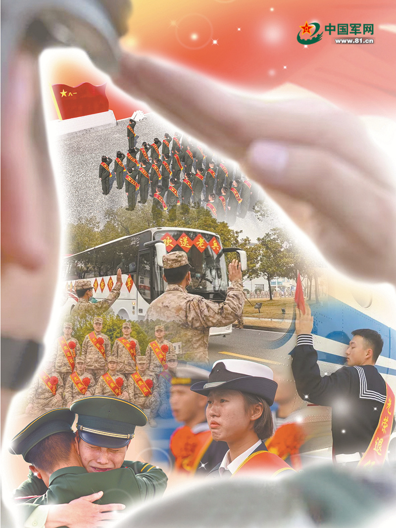 翌日清晨,满服役期的战友身着常服、背着行囊,与战友一一惜别。登车落座,《驼铃》声响。看着车窗外连旗飘扬,老兵们泪花顺颊而下……