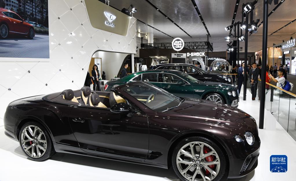 4月10日,观众在第三届消博会现场参观展出的宾利汽车。