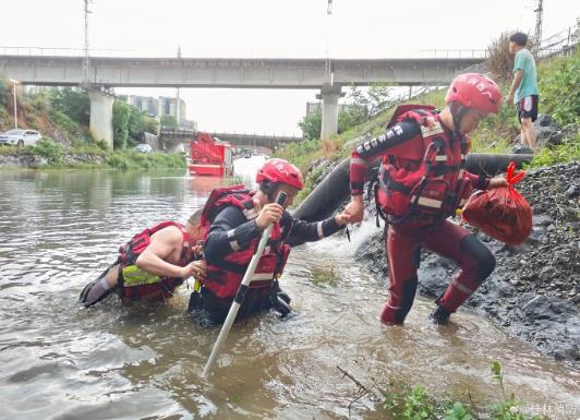5月22日,桂林灵川县八里七路前往朱家村方向,因突发大雨涨水,一辆半挂车被困在桥洞下,桂林消防救出车内2人。图片来源:桂林消防救援支队官方微博