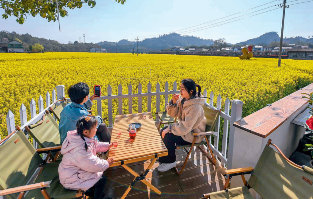 杭州市临安区太阳镇太阳米基地旁的一家民宿餐厅,客人在院子里喝茶赏景(2023年3月28日摄)徐昱摄/本刊